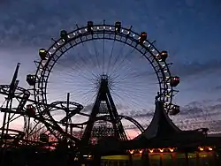 - 🌍 Riesenrad (Giant Ferris Wheel), Riesenradplatz 1, ☏ +43 1 729 54 30, fax: +43 1 729 54 30 20, info@wienerriesenrad.com. Varies by season, usually 09:00/10:00-19:45/23:45. An English engineering firm (Walter Basset) built the giant Ferris wheel from 1896-97. Others of the same era, built for world exhibitions and other parks in Chicago, London, Paris, etc. have long since been torn down. The Riesenrad has become a well-known symbol of Vienna, featured in many movies (most famously in The Third Man) and picture postcards. It has 15 gondolas, some of which are incredibly ornate and large enough to host an extended family inside, offering a spectacular panorama of the city. Additionally, the cabins are available to rent, for cocktails, dinners, or special events. The travelling time is 10-20 minutes. Adult 14+ €12, child €5.
