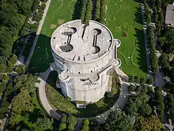 - 🌍 Flaktürme VII (Flak towers), Augarten, Leopoldstadt, ☏ +43 1 332 26 94 (Augarten management), office@kultur.park.augarten.org. Daylight hours. This is a pair of anti-aircraft defense towers/bunkers, built by the Luftwaffe during World War II. During construction multiple rail tracks were laid across the park, and it is believed that hundreds of war victims were buried in mass graves on the grounds, still undiscovered. At 55 m high, the round Gefechtsturm (G-Tower, or gun tower) is the highest flak tower built during the war. The pair have proven nearly impossible to remove, and are now protected because of their historic value.