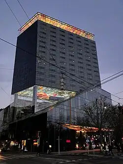 - 🌍 Sofitel Vienna Stephansdom, Praterstrasse 1. Check-in: 15:00, check-out: 12:00. The spectacular Sofitel, towering over the Donaukanal is one of the few tall buildings with direct view of the Innere Stadt and the towers of Stephansdom. Designed by the famed architect Jean Nouvel, it became a landmark itself, especially for the spectacular painted and lit ceilings over the 5th and top floors. The glazed Le Loft restaurant is visible from afar in the night and offers brilliant views throughout the days and nights so much that it is hard to get a table on most evenings. Other facilities include a spa and fitness centre and free Wi-Fi. The hotel is non-smoking throughout and accepts pets on request. Public parking €30/day. Doubles €220+.