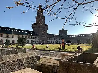 Torre del Bramante. The origin of the tower, at the highest point of the city near the castle, dates back to 1198 and was finished by Bramante at the end of the 15th century, while in the 17th century the baroque "onion" dome was added to replace the original one. conical spire. The tower has an original shape which, in the 15th century, was the model for the Filarete tower in the Castello Sforzesco in Milan; it is made up of sections that narrow as you approach the top. From the terraces it is possible to admire an excellent view of the Piazza Ducale, the castle and the whole city. 75 m high from the level of the square (57 m from the level of the court), the Torre del Bramante is the current Civic Tower of the city of Vigevano, of which it has always been the symbol. Furthermore, with its 57 m it is the tallest structure in the city of Vigevano. it is created by overlapping three floors sloping upwards. The first terrace is enclosed by the Ghibelline battlements, the upper section houses the clock, while the last contains the 17th-century bell. At the top rises the octagonal belvedere that crowns the tower. The belfry, inaccessible to the public, houses "il campanone", a large 17th-century bell "split" out of necessity. In fact, in the 19th century there were no modern electronic systems to control the bells, and the tower clock, mechanical at the time, struck every half hour even at night. It seems that the sound of the "big bell" was so loud that the inhabitants of the houses leaning against the castle and the piazza were practically unable to fall asleep. So they presented a petition in the municipality in which they asked to "silence" the bronze disturber! In the end a compromise was reached: from the bell, with almost surgical precision, a segment was removed in order to make it split and muffle the sound. And this is how it can still be heard beating every quarter of an hour today.