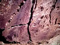 The rock engravings were discovered in 1994. They are supported by vertical shale surfaces, with preferential exposure to the east. The dimensions of the engravings vary between 15 cm and 180 cm, although those 40–50 cm in length predominate. The engraving techniques used are perforation and abrasion, which sometimes coexist, with the abrasion regularizing the perforation. The strokes are wide, although they are sometimes accompanied by a large amount of fine strokes, which served as a sketch or complemented the previous ones. In other cases, these thin lines draw shapes that are difficult to perceive. There are also engravings filled with multiple strokes.