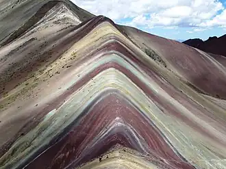 Vinicunca, otherwise known as "Rainbow Mountain", is a mountain in the Cusco region of Peru, near Mount Ausangate. In this area the mountains are partly formed by colored sediments, which give it its unique and surreal aspect.