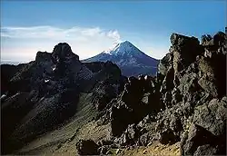 - 🌍 Popocatepetl (near Mexico City). Popocatepetl often has a volcanic plume above its crater which is 5,450 m (17,880 ft) high. The name means "smoking mountain" in the native Nahuatl language.