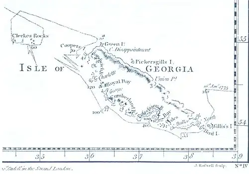 From 1772 to 1775, on the ships HMS Resolution and HMS Adventure, commissioned by the British government with advice from the Royal Society, he went to circumnavigate the globe as far south as possible to finally determine whether there was any great Terra Australis. On 17 January 1773, Resolution was the first ship to venture south of the Antarctic Circle, which she did twice more on this voyage. The final such crossing, on 3 February 1774, was to be the most southerly penetration, reaching latitude 71°10′ S at longitude 106°54′ W. Cook almost encountered the mainland of Antarctica, but turned towards Tahiti to resupply his ship. He then resumed his southward course in a second fruitless attempt to find the supposed continent. On this leg of the voyage, he brought a young Tahitian named Omai, who proved to be somewhat less knowledgeable about the Pacific than Tupaia had been on the first voyage. On his return voyage to New Zealand in 1774, Cook landed at the Friendly Islands, Easter Island, Norfolk Island, New Caledonia, and Vanuatu. Before returning to England, Cook made a final sweep across the South Atlantic from Cape Horn and surveyed, mapped, and took possession for Britain of South Georgia, which had been explored by the English merchant Anthony de la Roché in 1675. Cook also discovered and named Clerke Rocks and the South Sandwich Islands ("Sandwich Land"). He then turned north to South Africa, and from there continued back to England. His reports upon his return home put to rest the popular myth of Terra Australis. Cook's second voyage marked a successful employment of Larcum Kendall's K1 copy of John Harrison's H4 marine chronometer, which enabled Cook to calculate his longitude with much greater accuracy. Cook's log was full of praise for this chronometer, which he used to make charts of the southern Pacific Ocean that were so remarkably accurate that copies of them were still in use in the mid-20th century.