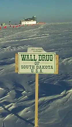 - 🌍 Wall Drug, 510 Main St (main exit off the interstate), ☏ +1 605 279-2175. 6:30AM-6PM daily. In 1931 the store's entrepreneurial owners, Ted and Dorothy Hustead, had the idea to give away free ice water for passing motorists. They started to put up signs and billboards along the highway showing the distance to Wall Drug. These signs have since been spread around the world. It is joked that based solely on the billboards, future archaeologists will probably consider Wall Drug to be the most important building on the North American continent. From this seed of signs and billboards grew the tourist attraction that Wall Drug is today: giftshops, museums, restaurants, and of course the original drug store. Get a bumper sticker while you're there; it's the mark of a true cross-country traveler. Free (includes ice water and bumper sticker).