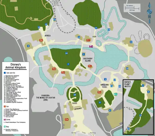 Animal Kingdom has four themed "lands" that surround Discovery Island. The first, clockwise from the Oasis, is Pandora – The World of Avatar, with its floating mountains and bio-luminescent forests. Next is Africa, where the Kilimanjaro Safaris take you into the park's savanna. Asia has the Kali River Rapids and, at its far end, Expedition Everest. Finally, DinoLand U.S.A. is where you'll find Chester & Hester's Dino-Rama and the Dino Institute.
