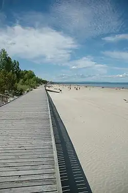In the summer months it is a very popular place for beach volleyball and sunbathing. A boardwalk runs most of the way along Beach 1 and 2. Beach 1 draws the largest crowds, with the popularity of the beaches decreasing further west. East of the town limits, the beach continues east and north into Tiny Beaches, nearly as far as the tip of the Penetang peninsula. The beach in these areas is also fronted by many cottages and homes, but unlike in Wasaga Beach, the beaches are mostly private property.