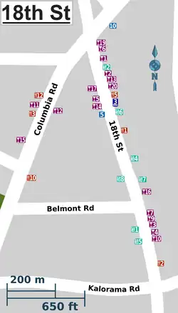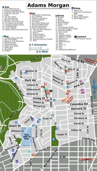 Adams Morgan is north of Dupont Circle and the U St Corridor. It is best known for the nightlife district on 18th St between Florida and Columbia Rd, which after midnight on weekends gets so packed full of revelers that it's hard to move down the sidewalk. It's more than that, though—it's a lovely, historic, culturally vibrant neighborhood, full of eccentric shopping, outdoor markets, great restaurants, and community murals! The name "Adams Morgan" is derived from the names of two formerly segregated area elementary schools — the all-black now-defunct Thomas P. Morgan Elementary School and the all-white John Quincy Adams Elementary School.