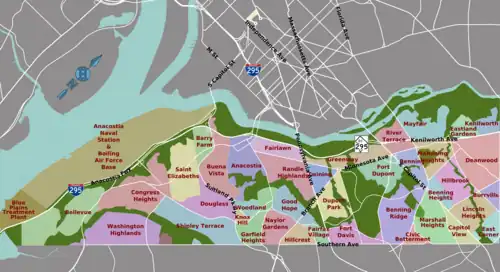 Post World War II, Anacostia underwent rapid and dramatic demographic change—from a population that was nearly 90% white to one that was (and is) over 90% black. The first catalyst for such dramatic neighborhood change was the construction of I-295, the Anacostia Freeway, which cut off the entire population of Greater Anacostia from the waterfront. Second, during the 1950s there was a large influx of new African-American residents—not coincidentally at the same time as the federal government made the D.C. public school system the first fully integrated system in the country in 1950. By 1957, the city became the nation's first majority black city, with a good deal of the city's African-American population living in the communities of Greater Anacostia which had been founded by free blacks as early as before the Civil War. The third catalyst was the creation of many massive public housing structures East of the River, which concentrated D.C.'s poorest residents in areas far away from the city center and its services and amenities.
