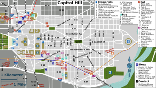 Capitol Hill is worth exploring regardless of your interest in politics, though. It is a beautiful historic neighborhood of 18th- and 19th-century rowhouses in a wide range of architectural styles, and a wandering stroll from the Capitol to Barracks Row along residential side streets is a nice way to take in this quintessentially Washingtonian neighborhood. The upscale dining scene is one of the best in D.C., particularly along Barracks Row (centered on 17th century U.S. Marines barracks at 8th and I St) and along Pennsylvania Ave. North of the Capitol Grounds is grandiose Union Station, which is both a major point of entry into the city, and also a historical landmark in its own right, with a beautiful, gilt main hall. The other big historical attraction is the huge Eastern Market, which is a fine place to browse, admire, or grab something good to eat.