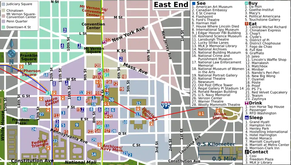 East End is D.C.'s old downtown quarter, east of 15th St, and includes the neighborhoods of Chinatown, Penn Quarter, Judiciary Square, and Mount Vernon Square. Most D.C. natives simply call this area Downtown.