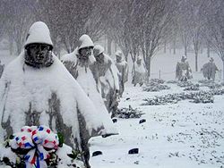 - π Korean War Veterans Memorial. This memorial is a little hidden in the woods, and perhaps that's appropriate for the memorial to the one major war of the twentieth century (in which over 600,000 allied troops died) that did not leave such a huge impression in the American mindβthe Forgotten War. It's easily one of the city's most powerful, though. The focus of the monument is the nineteen very realistic steel statues of American soldiers moving across the landscape (nineteen, because they total 38βreferring to the 38th parallelβwhen reflected in the water). The lighting at night leaves an especially disconcerting, ghostly impression. The best time to visit might be after a winter snow storm, which will help you remember the worst hardship of the warβthe snowy marches through the cruel Siberian winds.
