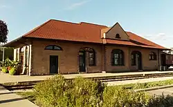 - π Waterloo Train Station, 20 Regina St S. The station was built for the Grand Truck Railway in 1910 and was closed to passengers in 1934. This one-storey, buff-brick building is in the Romanesque style with cut stone around windows, doors and the outside corners. The railway track beside the station is still active and used for overnight freight trains. The station building has been used as a retail shop.