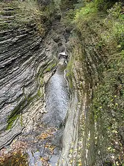 - 🌍 Watkins Glen State Park. Watkins Glen contains running trails and various small rock waterfalls at the southern tip of Seneca Lake. The waterfalls cascade down a long slot canyon/gorge. Camping and cabins are available. Trails in the gorge close in the off season (between Columbus Day and Memorial Day) when fees are not collected.