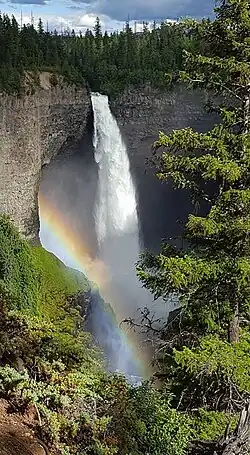 - π Helmcken Falls (46 km (29 mi) north of Clearwater along Clearwater Valley Road). A 141 m (463 ft) waterfall on the Murtle River, Helmcken Falls is the fourth highest waterfall in Canada, measured by total straight drop without a break. Helmcken Falls is one of the reasons for the original creation of Wells Gray Provincial Park.