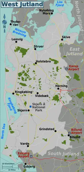 West Jutland comprise the western part of central Jutland. In Danish it is known as Vestjylland and administratively, it is part of the much larger Central Denmark Region that also includes East Jutland.