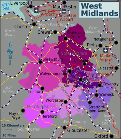 The West Midlands is the western part of central England in the United Kingdom. This central area borders North West England, the East Midlands, South East England, the West Country and all three parts of Wales (south, central and north). It is the only region of Britain and Ireland to lack access to the sea. While being heavily populated and industrialised, it retains much natural beauty in the rural areas surrounding the cities. Its main city, Birmingham, is the second largest in the UK.