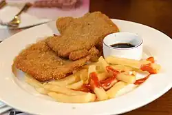 - katsu (カツ) — short for katsuretsu (カツレツ, "cutlet"), this the Japanese version of cutlet, escalope, or schnitzel: a thin slice of meat breaded and deep fried. Tonkatsu (豚カツ), the version that uses pork loin, is the most common, though other meats such as chicken (チキンカツ chikin katsu) or beef (牛カツ gyūkatsu) can sometimes be used. As a main dish, it's usually served with a thick vegetarian brown sauce and shredded cabbage. It can be served over a bowl of rice and covered in an egg and sauce mixture to make katsudon (カツ丼), one of several popular varieties of donburi (rice bowl). It's also commonly served together with Japanese curry rice, in which case in the dish is known as katsu karē (カツカレー).