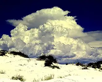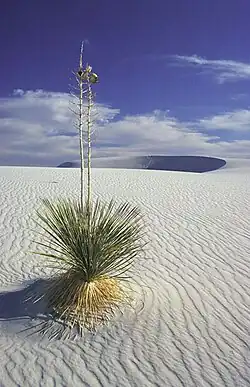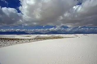 White Sands National Park is an American national park in the southeastern region of the state of New Mexico. The park contains the world's largest gypsum sand dune field—275 sq mi (710 km2) of fine white sand, formed by the prevailing winds into large ridge-like dunes.