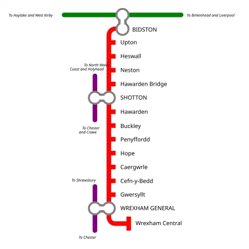 There is also the much less used Borderlands Line, where trains run only hourly, via stations Bidston, Upton, Heswall, Neston to North Wales terminating at Wrexham.