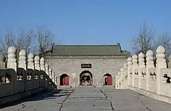 Baiyun Temple🌍Wanxianshan Scenic Area(万仙山景区, Guoliang Tunnel)(there are several buses per day from 🌍Huixian Bus Terminal (辉县汽车站), most of them originating in Xinxiang).This area in the Taihang mountains on the border with Shanxi features a valley encircled by more than 100m high sandstone cliffs and is protected as a national geological park and national forest park. Atop the cliffs sit small villages, and above those villages are even higher limestone cliffs. The villages in the area, including Guoliang, are made from slabs of this stone held together with white mortar, making the buildings visually striking. To enable access to their village, in the 1970s, residents of Guoliang village hacked a tunnel through the lower cliff, which is now a tourist attraction. The village of Kunshan, just across the border in Shanxi and accessible by the park shuttle bus, later carved an even longer and more hair-raising tunnel through the upper limestone cliff to access the rest of their province. This tunnel, which starts about 3.5 km outside Kunshan village and 200 m above it, is not accessible by anything larger than a minivan and is closed to the general driving public. Hiring a local vehicle can get you there, at a price that the drivers will agree on amongst themselves once they see you.(updated Jun 2018)