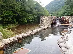 - The unnamed third hot spring is on the river side of the road before the other two, unmarked except for a break in the guardrail and stairs descending towards the river. While it once consisted of two concrete tubs formed into the surrounding rocks, the concrete has since deteriorated and washed away in the years following the Tohoku earthquake. The springbox itself is intact, however, and the water flows freely down a few natural miniature ponds worn into the rock. The industrious visitor can dam up the gap in the rock where the water exits into the river with rocks and debris and a pool will soon form deep enough to sit in. The "pool" is still clearly visible from the trail on the opposite river side, so the modest may wish to wear some appropriate swimming clothes, or visit at night.