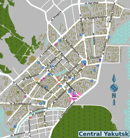 - The Old City (Старый город). The Old City, reconstructed in the architectural style of the 19th century, is in the very center of Yakutsk, and is bordered by the streets Ammosov, Arzhakov, and the Plaza of the Fallen Soldiers (Аммосова, Аржакова, плошадь Павших бойцов). The streets are off limits to traffic, paved as they are with wooden billets, and there are cafeterias, markets, all in the city's favorite place to relax. Here you'll find the restored Preobrazhenskaya Church, the founders monument, the memorial to fallen soldiers, a stone column dedicated to the 375th year anniversary of Yakutia joining the Russian Empire, and the M.K. Ammosov museum (Ammosov was a prominent Yakut political activist who led an active role in bringing Soviet power to Siberia).