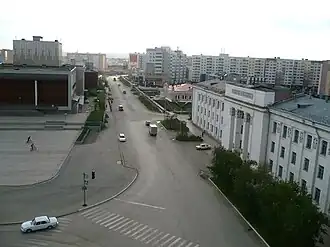 - 🌍 Victory Stele (Стелла Победы). A large stele at the north end of Victory Square (Площадь Победы) dedicated to the Soviet victory in World War II, topped with a statue of the hero (N'urguna Bootura) of the Yakut national epic "Olonkho."