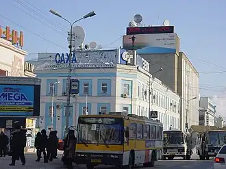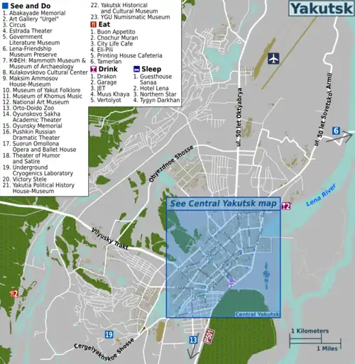 - 🌍 Tygyn Darkhan (Тыгын Дархан), ul. Ammosova, 9, ☏ +7 4112 43-51-09. In the center of the city, it hosts one of the best known local restaurants (see above), a souvenir shop, bar, conference room, exercise room, sauna, pool, money change, and breakfast included. From 3,240 rubles.