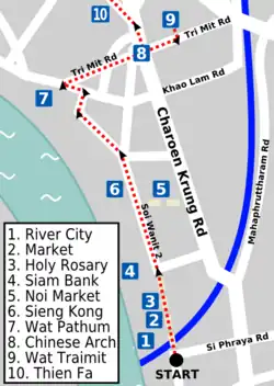 Start out early if you can, as this tour will probably take the whole day. The route starts at Si Phraya Pier, proceeds to Yaowarat, then ventures through Phahurat and in the evening you will go back to Yaowarat to see its blazing neon lights at work. Do not trust maps — the map that perfectly shows every little alley of Yaowarat still has to be created. Be sure to print this article and the corresponding map, so you have a general overview of the area while walking. You will get lost — but as long as you have the map, you will somehow find your way back on track. You may want to print the Yaowarat and Phahurat district article for alternative listings.