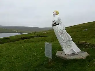 - π The White Wife, a ship's figurehead, is seen by hiking east to Ness of Queyon. That ship was the Bohus, a barque (three-masted sailing ship) built in Scotland and sold to Germany. In 1924 she was put to use as a sail training vessel but it looks like the students flunked, as she was wrecked here. Her original wooden figurehead has rotted away so what's here now is a fibreglass replica.