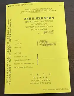 A vaccine is available which provides immunity for at least ten years. Many countries will require that you be vaccinated against yellow fever if you are coming from a country where it is present or have been in such a country within the last 6 days (the incubation period). If this is the case you will need to present a "World Health Organization International Certificate of Vaccination" with an appropriately dated certification on the "International Certificate of Vaccination or Revaccination Against Yellow Fever" page to immigration officials. This little yellow booklet will be given to you when you are vaccinated against yellow fever for the first time, which is valid for life. Carry it with your passport: you'll typically present them to immigration officials at the same time.