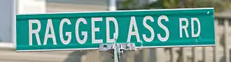 - π Ragged Ass Road (150 m long between Brock and Hamilton drives near the lakeshore). This otherwise undistinguished short unpaved residential street is known for its name, which started as a joke among prospectors about their lack of success one season, far beyond Yellowknife. Before you get a signature souvenir sign or T-shirt from one of the many shops in town that sells them, you might want to walk down the actual street and take a picture of the official sign, now that the city has finally acknowledged its existence, so you can confirm to people you tell the story to back home that, yes, this street actually exists.
