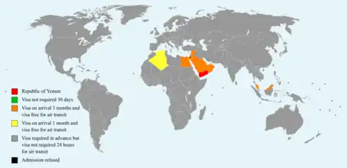 Visa regulations change quite regularly, and an embassy should be contacted to make certain that the relevant documentation is obtained (it is recommended also to ask one of the licensed tour operators in Sana'a). Citizens of most countries (with the possible exception of Gulf Co-operation Council members) must obtain visas in advance. Most visas are valid for 30 days from the date of issue (3 months for European Union, but sometimes it depends on the mood of the official dealing with you). If you have a local contact to help you push the paperwork through, this can increase your chance of getting the visa. Another way of getting visa is via one of the licensed tour operators, as they are allowed to prepare pre-visa paper in the Ministry of Foreign affairs for their clients. Such pre-visa paper is valid for 30 days from the day of issue and upon this a real visa is issued at the Sana'a airport.