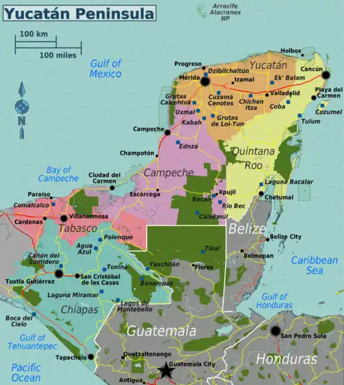 The Yucatán Peninsula is a region of southeastern Mexico, consisting of the Mexican states of Yucatán, Campeche, and Quintana Roo. The adjacent states of Tabasco and Chiapas are also considered part of the Yucatan region on Wikivoyage.