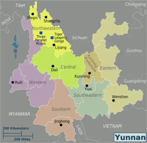 | Northwestern Yunnan A chunk of ancient and historic Tibet within Yunnan's provincial boundaries. Many travelers come here to experience Tibet without having to enter the actual province and follow the road to West Sichuan. You will find towering mountain ranges and fascinating local culture here. It includes Lijiang Prefecture and Diqing Prefecture. |