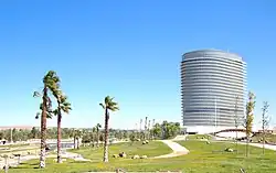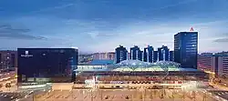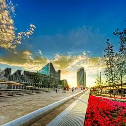 Zaragoza has retained relative affluence by becoming a major industrial hub, with factories spread over several industrial parks around the city, and a big logistics hub (named PLAZA, or Plataforma Logística de Zaragoza), taking advantage of its strategic location on the railway line between Madrid and Barcelona and its airport, focusing on freight. The Expo 2008 universal exhibition held in the city resulted in massive development of its western outskirts into exhibition grounds, which have been repurposed for business, civic services and public recreation grounds.