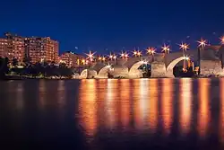 - 🌍 Puente de Piedra (Stone Bridge). The central bridge of Zaragoza, built in the 15th century and reconstructed many times afterwards to repair flood damage and reinforce the construction. Today it is restricted almost entirely to pedestrian traffic and features four pillars at its ends with lions, symbols of Zaragoza.