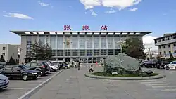 - 🌍 Zhangye Station (张掖站) (At the end of Zhanghuo Gonglu, 6.5 km northeast of the central part of town. Bus No.1 runs from the train station to the centre of town (Drum Tower) and costs ¥1 (correct change only). Taxis will charge a set fee to the city of ¥12-15 and will be unlikely to use their meters.). Approximately 49 passenger train services use this station daily to destinations as far off as Beijing, Chongqing, Chengdu, Urumqi and Lanzhou. However obtaining a ticket on long-distance through trains can be difficult, often requiring travellers buy a ticket to Lanzhou first. There is a railway ticket office downtown in Marco Polo Street, for a ¥5 surcharge, negating having to travel out to the station.