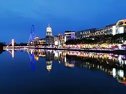 - 🌍 Zhongshan Sky Wheel (幻彩摩天轮), Level 5, Block C, Central Power Plaza, 9 Fengming Road, Shiqi District (石歧区凤鸣路9号兴中广场C座5楼) (the closest bus stop is the Central Power Plaza (兴中广场) bus stop, which is served by bus nos. 001, 010, 077, 209, and k13), ☏ +86 760 8998-2999, zsskywheel@126.com. 10:00-22:30. The Zhongshan Sky Wheel is a 108-m-high Ferris wheel on the roof of a shopping centre in Zhongshan's downtown area. Perhaps due to its central location, the Zhongshan Sky Wheel is often considered to be one of the city's most important landmarks. A souvenir shop near the ticket gate sells various kinds of minature Ferris wheels and other Zhongshan-related gifts. Adults ¥68, children ¥35.