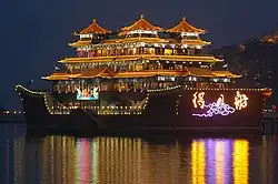 - 🌍 Deyuefang Seafood Restaurant (得月肪海鮮酒樓; Déyuèfáng Hǎixiān Jiǔlóu), Inside Mingting Park, Yeli Island, Xiangzhou District (香洲区野狸岛名亭公园内; Xiāngzhōuqū Yělídǎo Míngtínggōngyuánnèi) (From Gongbei, take bus 9 or the sightseeing bus along Qinglu Road (Lovers' Road) until you see the ship and bridge on your right, just as the bus turns left, get off the bus and walk across the bridge; from Jusco, walk south along the main street to the first corner and turn left, the bridge is one block ahead), ☏ +86 756 2251188. Large and popular high-end seafood place on an impressive looking boat in Xiangzhou harbour.