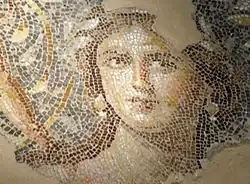 The Roman villa is arguably the centerpiece of the discoveries, containing one of the most famous mosaics in all of Israel. It was built around the year 200, and destroyed in the earthquake in 363. The villa is in the traditional form of a triclinium; seats would have been arranged in a U-shape around the mosaic, Roman villa mosaic floor and people would have reclined while dining and drinking, talking and contemplating the mosaic images. The mosaic, for the most part, is devoted to Dionysus, god of wine, and of socializing. He is seen along with Pan and Hercules in several of the 15 panels.